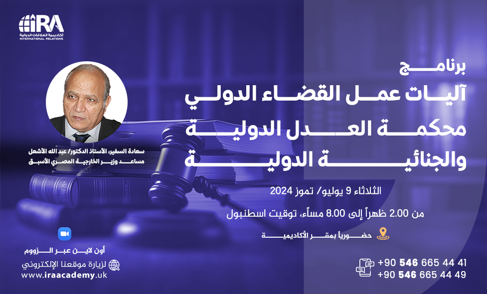 برنامج تدريبي وورشة عمل تحت إشراف أكاديمية العلاقات الدولية، يتعرف من خلاله المشاركون على مفهوم وأهمية وأهداف وآليات عمل القضاء الدولي، وإشكاليات تنفيذ أحكام المحاكم الدولية، مع استعراض لأهم المحاكم الدولية، وعرض لعدد من التجارب والخبرات العملية في التقاضي أمام محكمة العدل الدولية والمحكمة الجنائية الدولية، مع التطبيق على القضية الفلسطينية، وخاصة بعد معركة طوفان الأقصى، والدعوى التي حركتها دولة جنوب أفريقيا وانضم إليها عدد من دول العالم أمام محكمة العدل الدولية ضد إسرائيل.